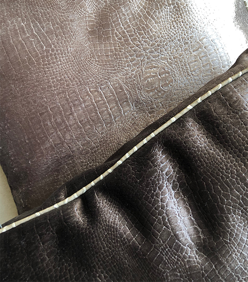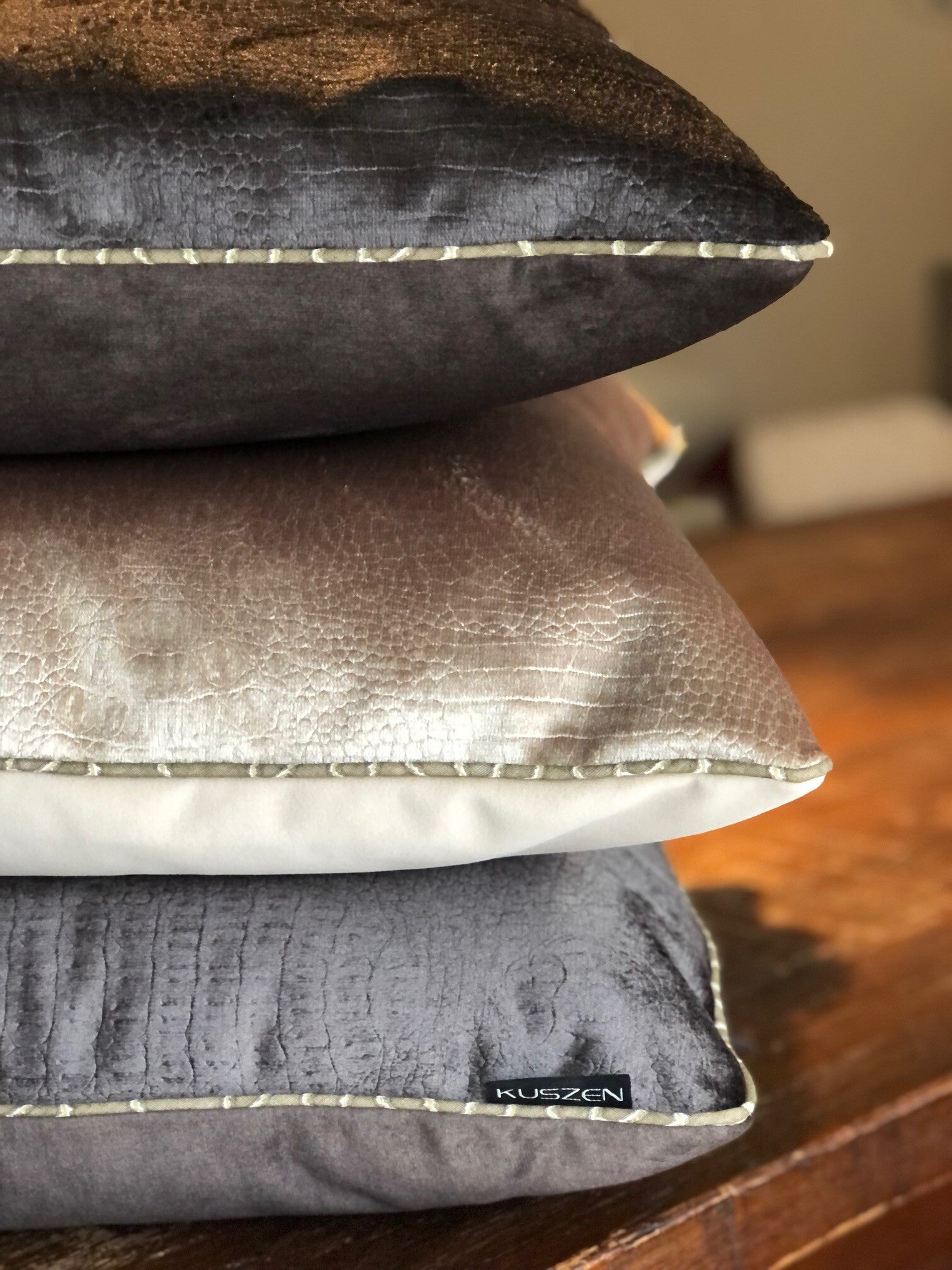 Mooi sierkussen in een luxe croco velvet stof. De handgemaakte hoes met rits is aan beide zijden van dezelfde stof en afgewerkt met een bies.