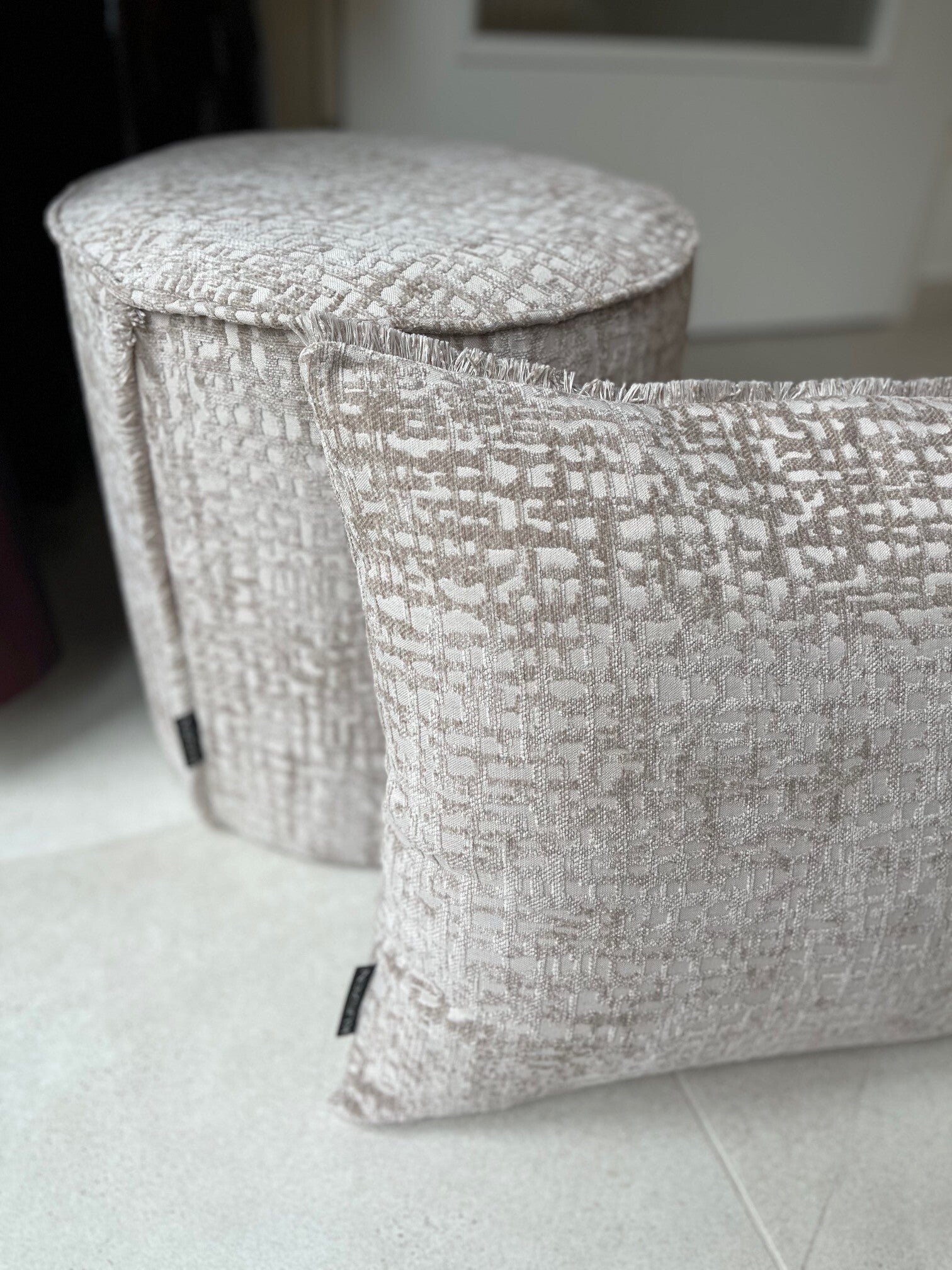 Luxe harde poef uit de BLACK LABEL-serie in een mooie reliëf stof met sierband en rafelrand als leuk detail. De luxe poef kleurt uw interieur en geeft het een rijke uitstraling. De poef combineert mooi met de kleurrijke ZigZag kussens, de fluweelzachte kussens uit de velvet-serie of met de Mix&Match kussens van KUSZEN.
